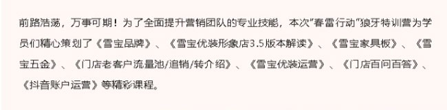 不負春光起好步,乘勢而上開新局!新歲開啟,為進一步強化營銷人員的專業技能和更好的服務客戶,2月3日-5日,雪寶家居集團營銷先鋒2023“春雷行動”狼牙特訓營勝利召開并取得圓滿成功。